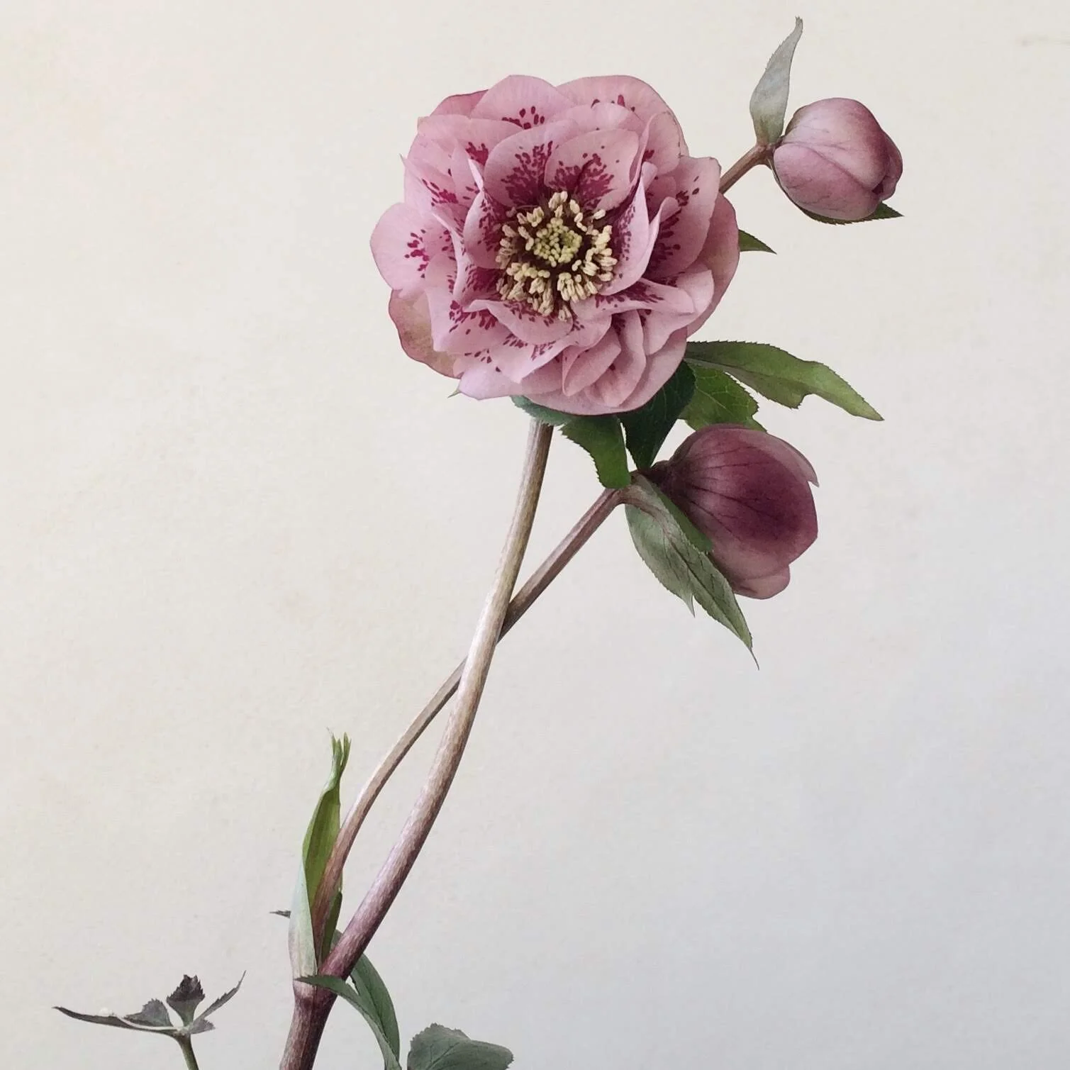 And every time hellebore season comes round (Jan/Feb) the flower facebook groups fill with wilting woe and appeals for conditioning tips. There are snake oil promises about how to keep them perfect, each more involved that the next. Pins in the stems. Slitting the stem from tip to the neck of the flower. Life is truly too short. Some swear by searing and them overnight in cool water, but I dispute that this is anything close to reliable with hellebores in full flower. This makes sense if you understand that the bit that we think of as the petals of a hellebore are actually the sepals. The petals are within the fluffy central part. Look carefully, and there is a ruffle behind the anthers. This is the actual flower. (More accurately called nectaries, but let’s not get too technical.)